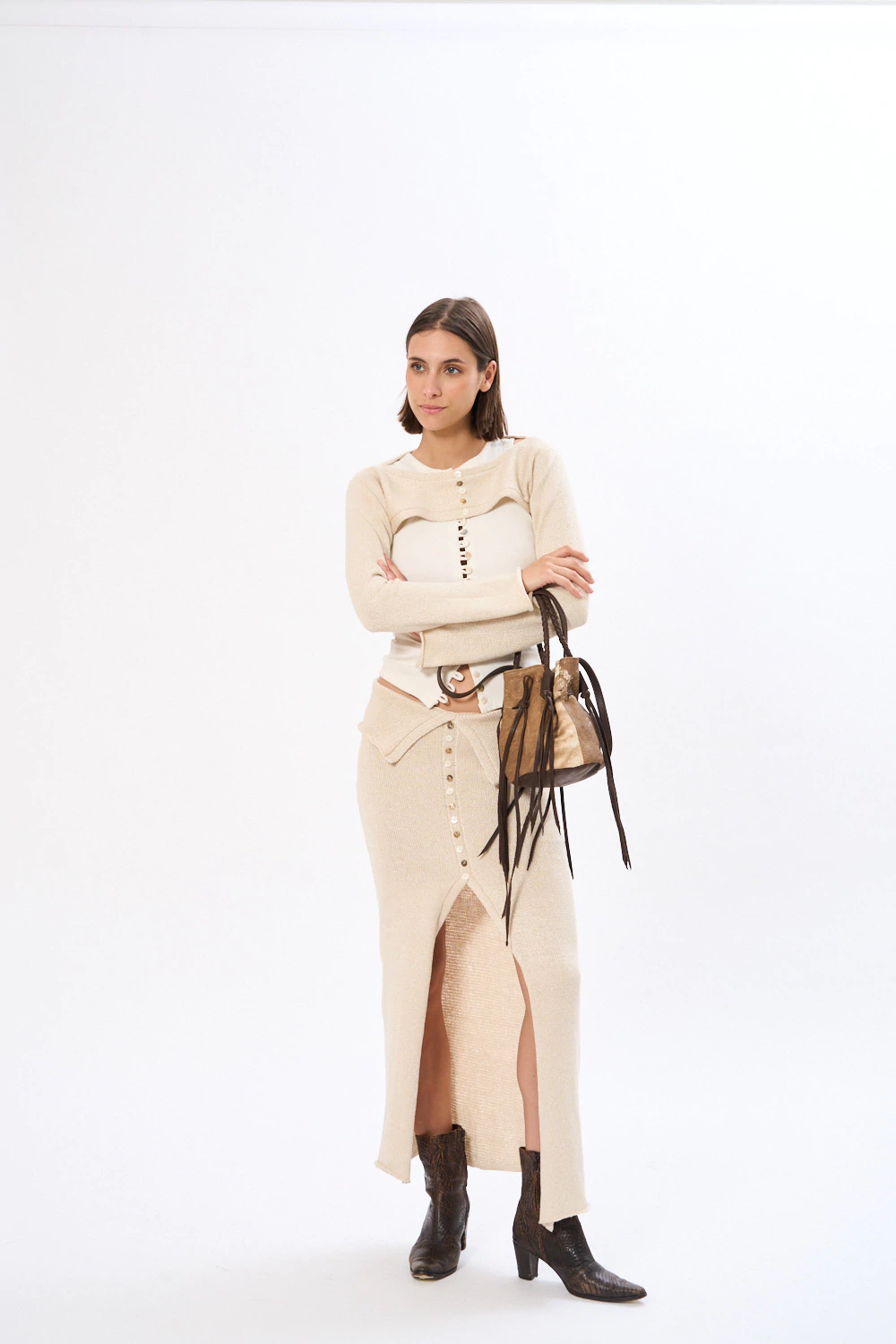La Cartera Chamuyo tiene carácter y movimiento. Hecha en cuero natural con tiras largas y trenzadas, combina textura y actitud en una silueta descontracturada.