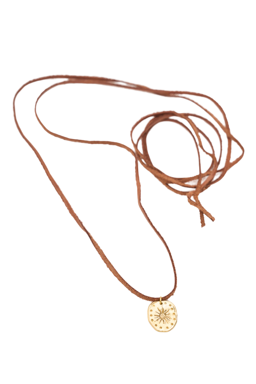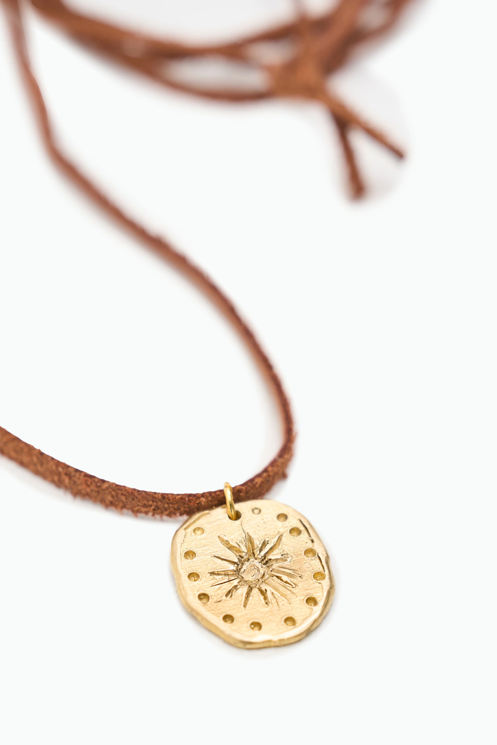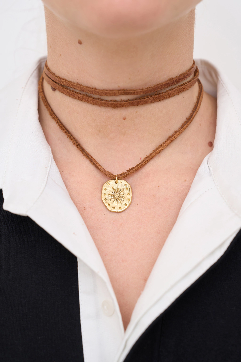 Colgante rústico en bronce. Técnica de texturado de golpe rústico. Te entregamos la pieza de bronce en un cordón de cuero regulable. Podés usar el colgante largo o darle dos vueltas y usarlo ajustado al cuello.