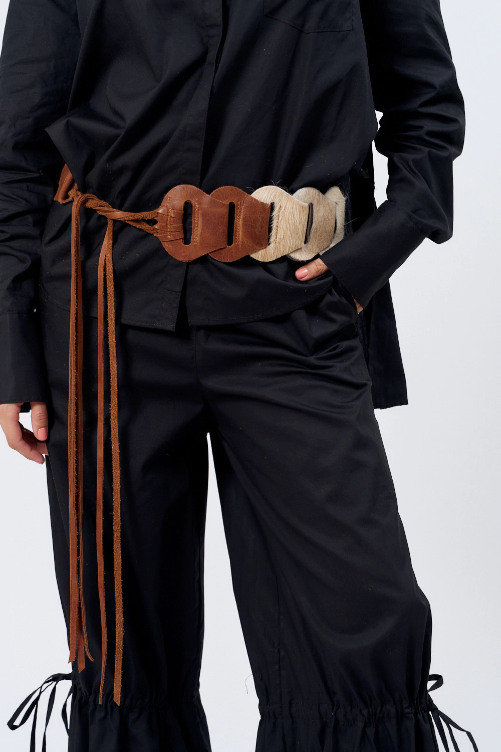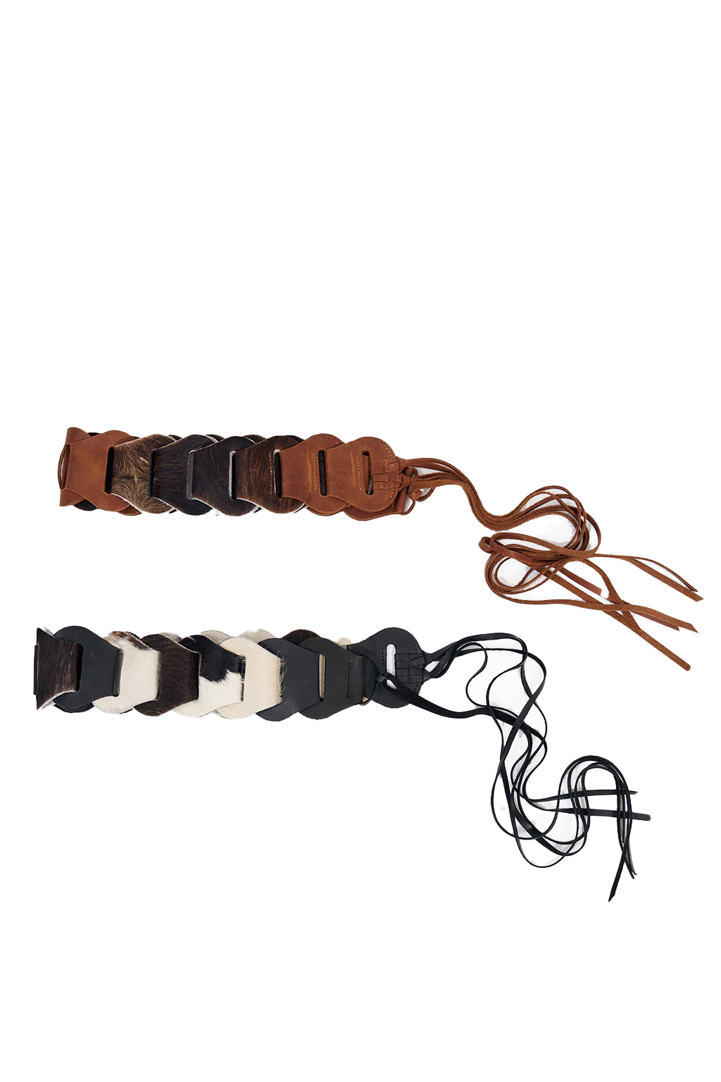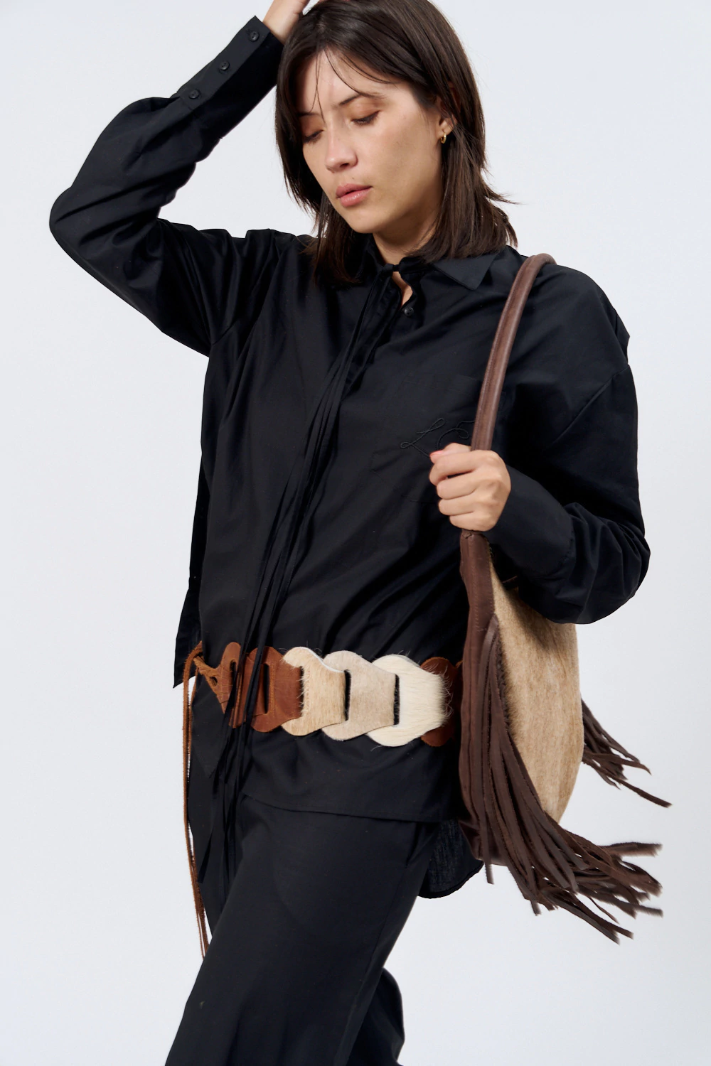 La Faja Arizona nace desde el corazón de nuestras carteras: confeccionada con retazos de cuero reciclado entrelazadas, creando una trama única y artesanal. Su diseño combina textura y estructura en perfecta armonía. Cuenta con tiras largas para que puedas regular tu faja y llevarla como quieras: a la cintura o a la cadera.