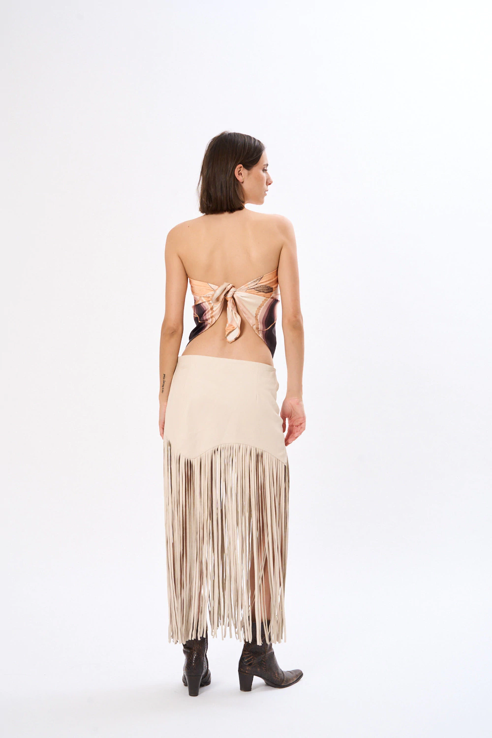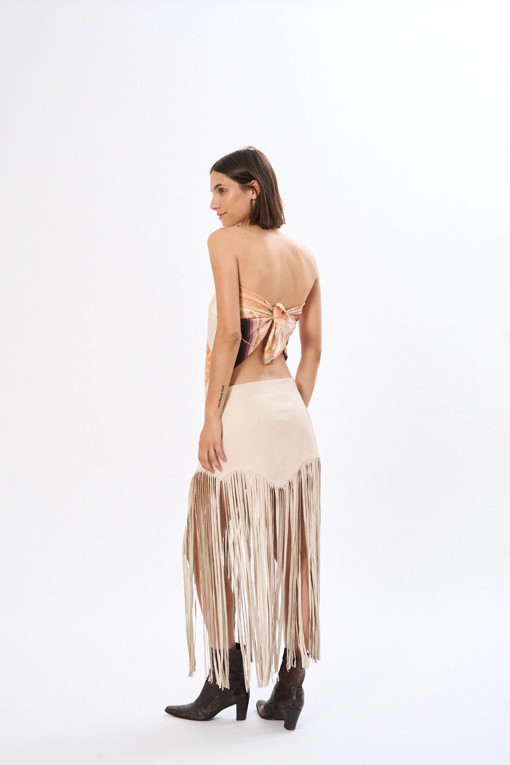 Rematada con flecos en todo su contorno, la prenda cobra vida con cada paso, creando un efecto dinámico y sofisticado. Cuenta con un cierre lateral metálico que asegura un calce perfecto y un acabado prolijo. Diseñada para combinar con el Top Silvestre, forma un conjunto original y distintivo, ideal para quienes buscan piezas únicas con identidad artesanal.