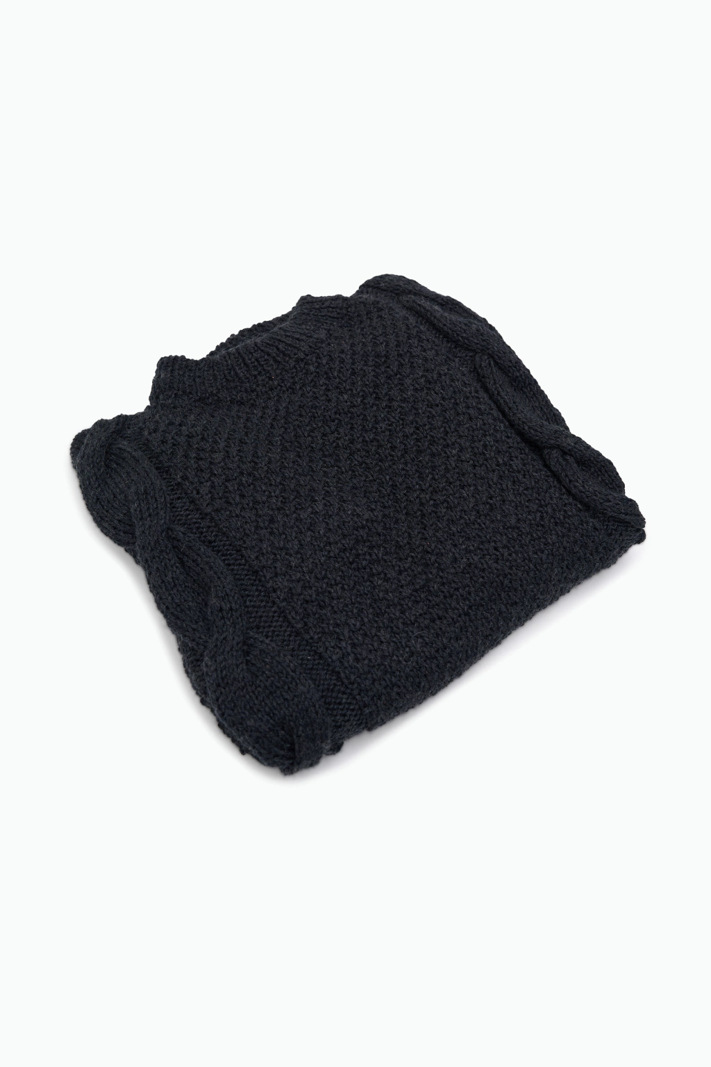 Terminado con punto elastico en puños, cuello y base. Hecho a mano con trenzas y punto arroz. Detalle de etiqueta de cuero LC por detrás.
