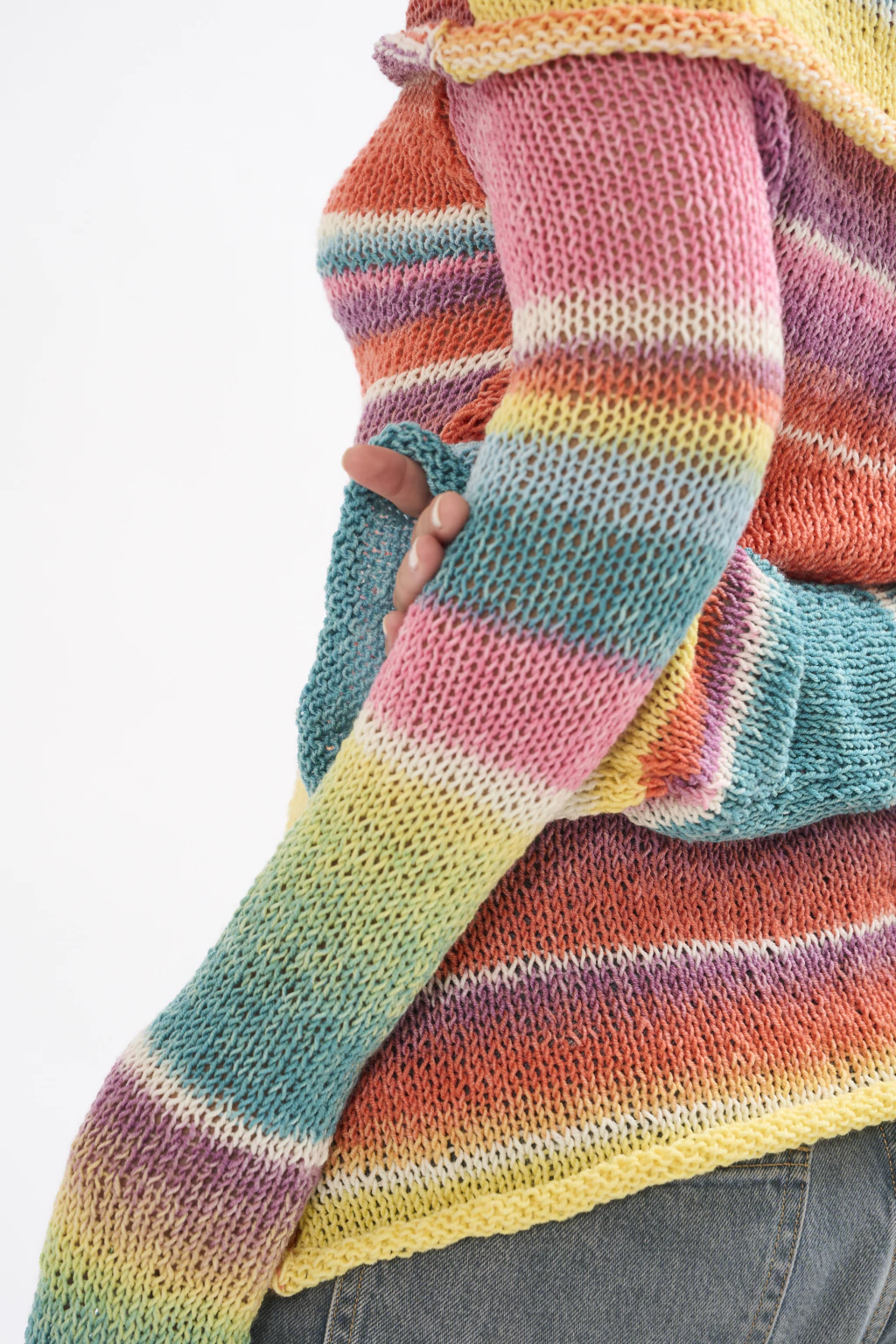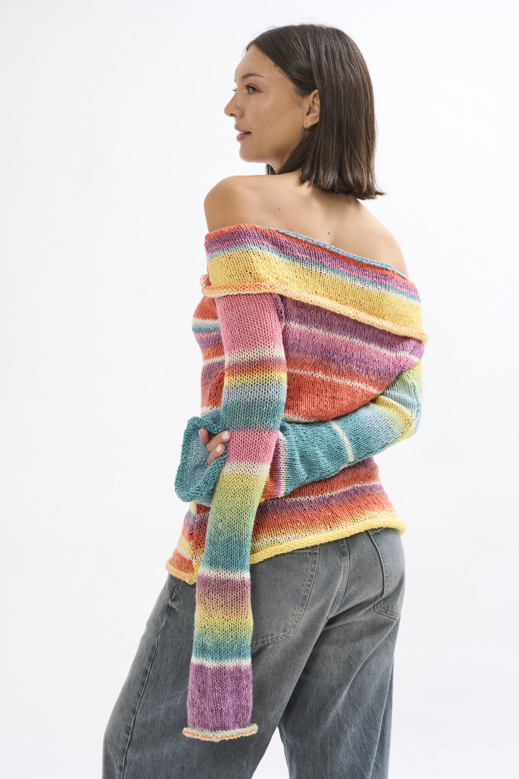 Puro color, pura alegría. Nuestro Top Ojai, tejido a mano con 100% lana merino extrafina, está disponible en cuatro combinaciones únicas y matizadas. En cada variante se mezclan diversión, calidez y espíritu libre. Con mangas extra largas y un cuello bote volcado que deja los hombros al descubierto, su calce es único y lleno de actitud.